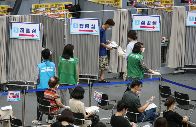 27일 오전 서울 송파구 송파체육문화회관에 설치된 백신 접종센터에서 시민들이 백신을 맞기 위해 접종실로 들어가고 있다. 연합뉴스 제공
