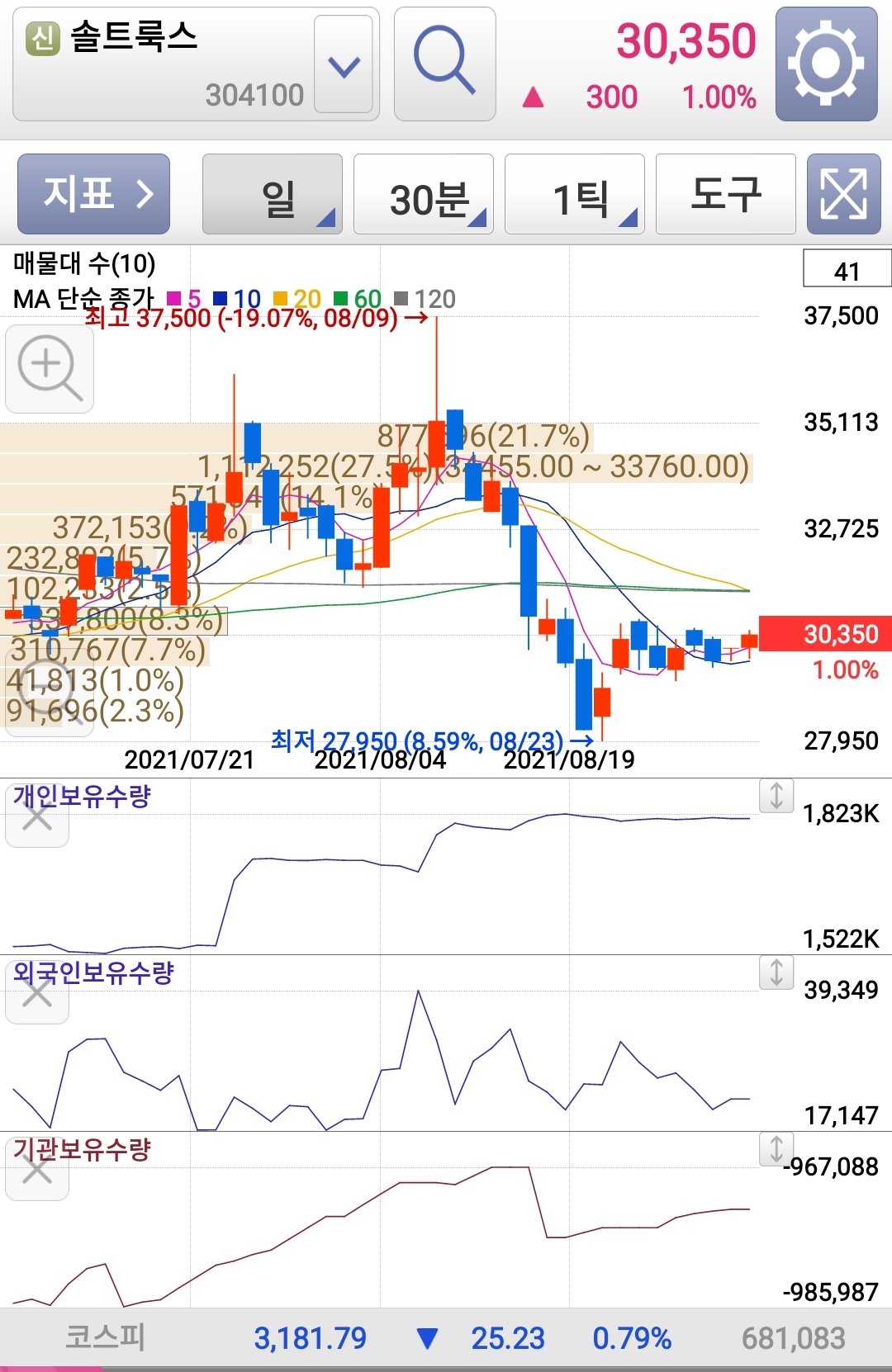 아래의 지표는 참고하시라고 첨부했는데, 특히 개인보유수량이 꾸준히 늘어나는 게 보이고, 외국인보유수량, 기관보유수량을 참고로 파악하는 것이 좋을 거라 생각된다.