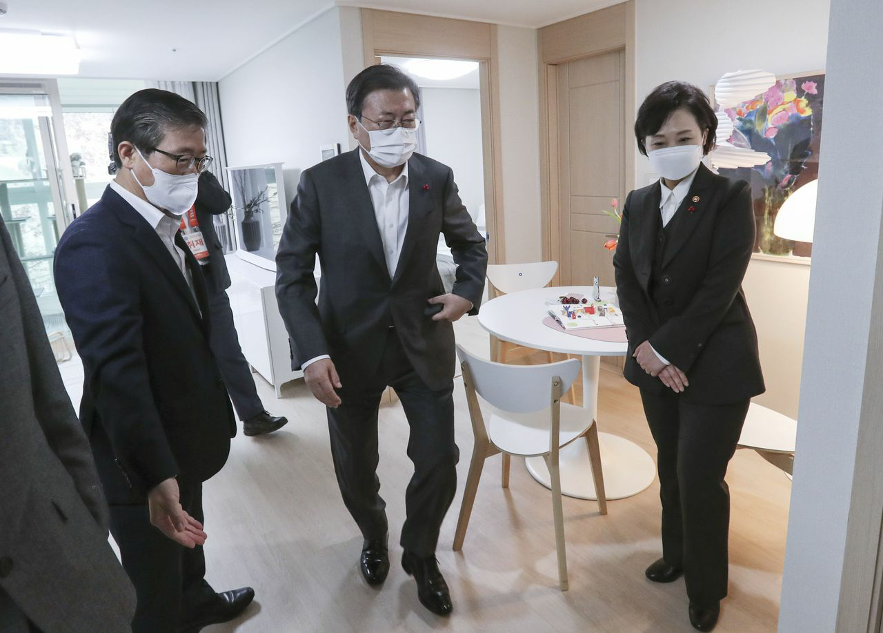 문재인 대통령이 지난해 12월 11일 경기 화성시 LH 임대주택 100만호 기념단지인 동탄 공공임대주택에서 김현미 국토교통부 장관, 변창흠 국토교통부 장관 후보자(현 LH 사장)와 함께 단층 세대 임대주택을 살펴보고 있다./연합뉴스