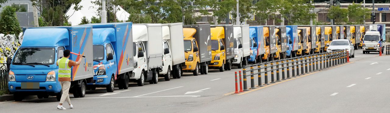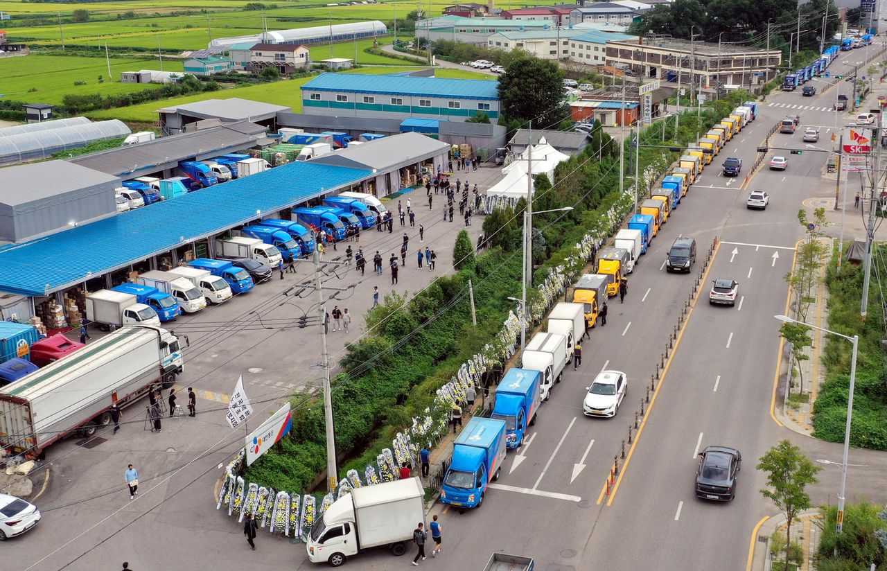 2일 오전 경기도 김포시 한 택배업체 터미널 인근 도로에 40대 택배대리점주 A씨를 추모하는 택배차량이 줄지어 정차돼 있다. A씨는 노조를 원망하는 내용의 유서를 남기고 지난달 30일 극단적 선택을 했다./연합뉴스