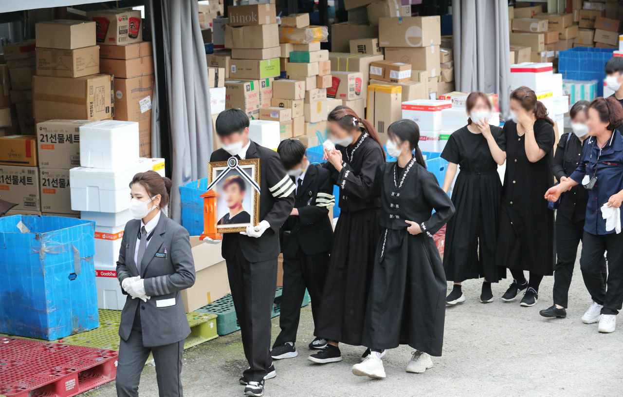 2일 오전 경기도 김포시 한 택배업체 터미널에 마련된 택배대리점주 이모씨의 분향소에서 유가족들이 노제를 지내며 마지막 배웅을 하고 있다. 이씨는 노조를 원망하는 내용의 유서를 남기고 지난달 30일 극단적 선택을 했다. /남강호 기자