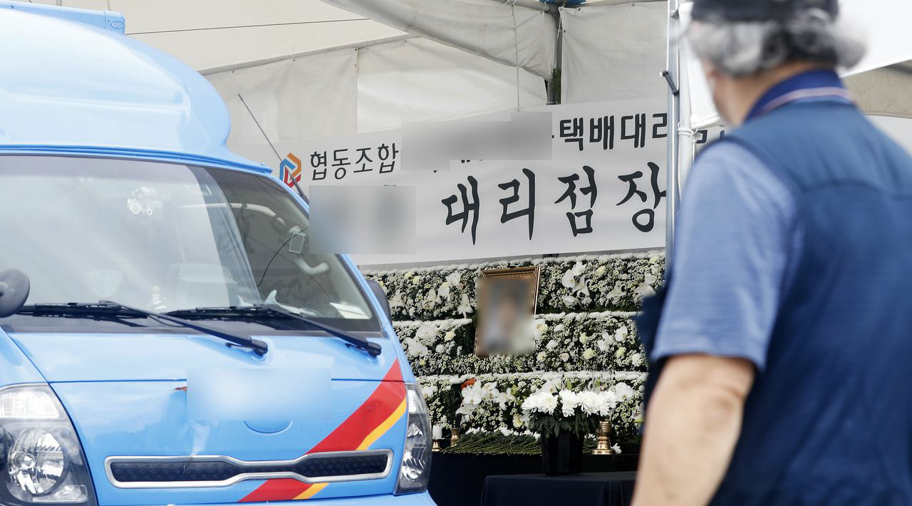택배 노조와 갈등이 담긴 유서를 남기고 극단적 선택을 한 40대 택배대리점주 이모씨의 발인식이 진행된 2일 경기도 김포시 한 택배업체 터미널에 고인의 분향소가 마련돼 있다. /뉴시스