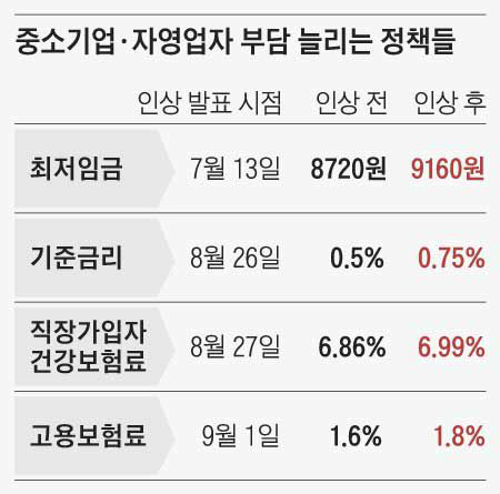 금리 인상도 자영업자와 중소기업엔 큰 악재다. 경기도 반월공단에서 주물공장을 운영하는 최모(45)씨는 매달 인건비로 1억5000만원 가까이 들어간다. 매출이 줄어 월급을 주기 어렵게 되자, 올해 초 은행에서 3억원을 빌렸다. 기존 대출 7억원까지 합치면 매달 나가는 이자만 300만원 가까이 된다. 최씨는 “금리가 올라 다음 달부터 이자가 늘게 생겼다”며 “내년 최저임금까지 오르면 돈을 더 빌려야 할 수도 있어 암담한 상황”이라고 말했다.