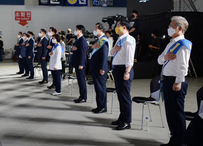 4일 오후 대전시 유성구 도룡동 대전컨벤션센터에서 열린 더불어민주당 대선 후보자 선출을 위한 대전·충남 합동연설회 시작에 앞서 후보들이 국민의례를 하고 있다. 연합뉴스