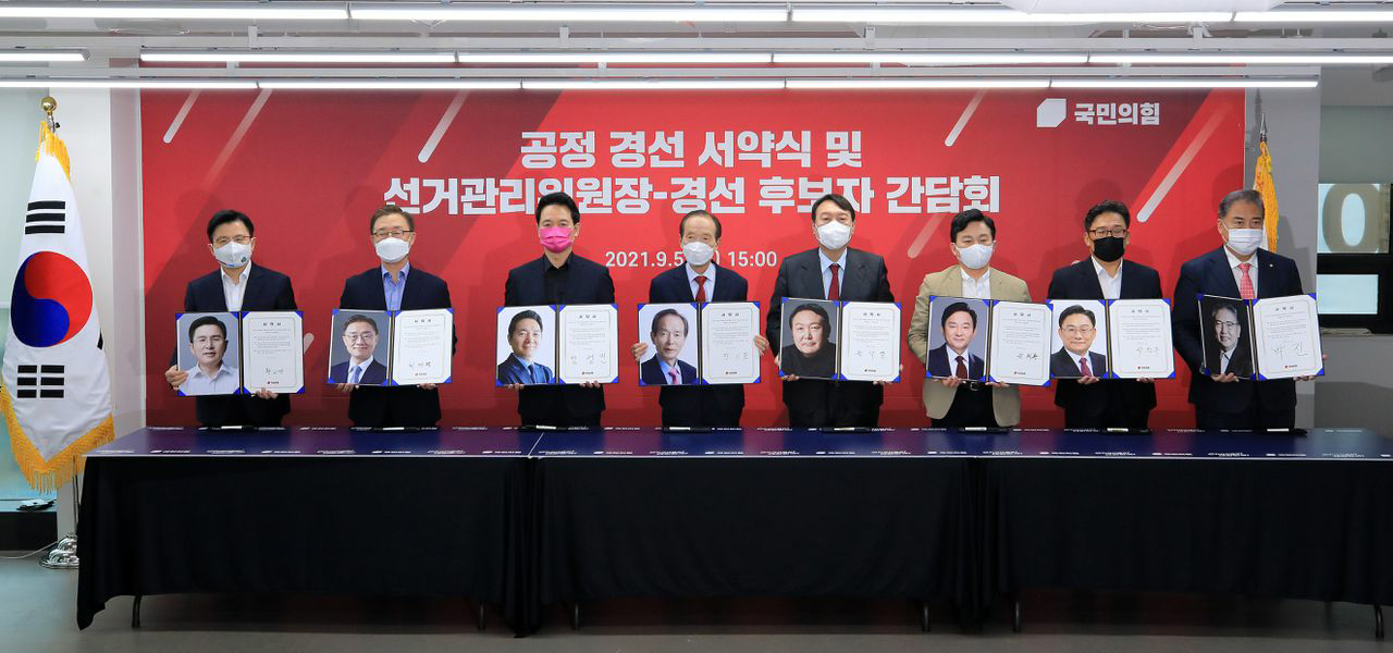 국민의힘 대권주자인 황교안(왼쪽부터), 최재형, 장성민, 장기표, 윤석열, 원희룡, 박찬주, 박진 후보가 5일 서울 여의도 국민의힘 중앙당사에서 열린 공정경선 서약식에서 서약서를 보여주며 기념촬영하고 있다.