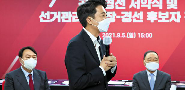 국민의힘 이준석(가운데) 대표가 5일 서울 여의도 국민의힘 당사에서 열린 공정 경선 서약식 및 후보자 간담회에서 발언하고 있다. 이 대표 뒤편은 윤석열(왼쪽) 국민의힘 경선 후보와 정홍원(오른쪽) 경선 선거관리위원장. /이덕훈 기자