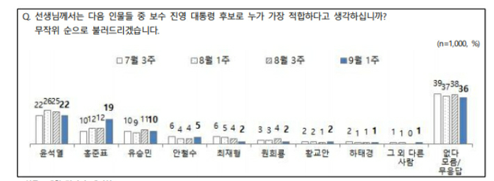 ◇ 김현정> 알겠습니다. 여기까지, 일단 여기까지 말에 대한 평가를 한 다음에 2분 정도 남았는데 이 얘기를 해 보고 싶어요. 결국 윤석열 대 홍준표, 홍준표 대 윤석열. 국민의힘에서 두 주자간의 여론조사 지지율 차이가 좁혀져 가면서 지금 두테르테 논쟁도 나온 거거든요. 최근의 여론조사 표 보여주십시오. 최근 겁니다. 이게 8월 30에서 9월 1일 사이에 성인남녀 1012명을 대상으로 엠브레인퍼블릭, 케이스탯리서치, 코리아리서치, 한국리서치 4개 여론조사 기관이 조사한 거예요. 윤석열 22%, 홍준표 19%, 유승민 10%, 안철수 5%, 최재형 2%, 이런 식으로 갑니다. 윤석열 대 홍준표 두 분의 차이가 22% 대 19% 차이까지 줄어어요. 줄어들었어요. 이건 두 분이 평론가 시점에서 평가해주시죠. 마무리 30초씩 드릴게요. 박성준 의원님?