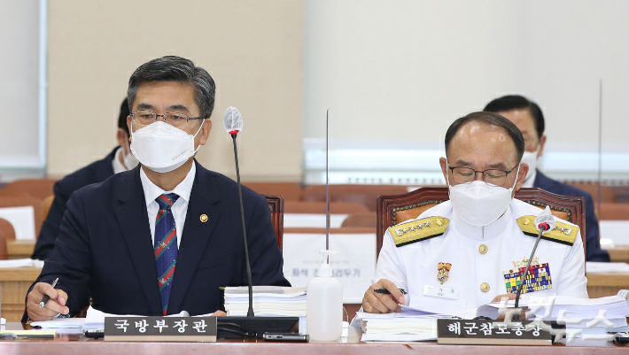서욱 국방부 장관(왼쪽)과 부석종 해군참모총이 지난달 20일 국회에서 열린 국방위원회 전체회의에 참석한 모습. 윤창원 기자