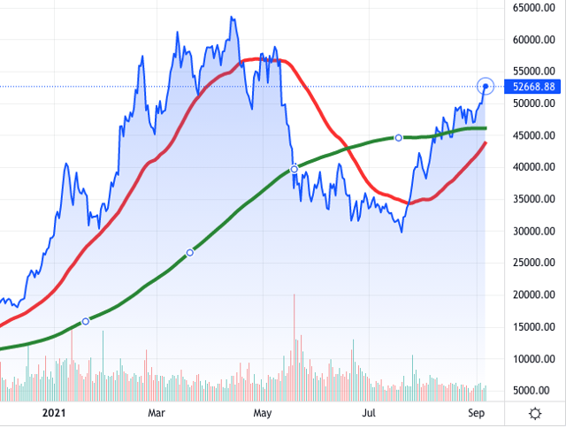 '골든크로스'가 임박한 비트코인의 차트. 지난 6월 자산 가격의 단기(50일·빨간색 선) 이동평균선이 장기(200일·초록색 선) 이동평균선 밑으로 떨어지는 '데드크로스'를 맞이한 비트코인은 최근 이동평균선 간 격차를 좁히며 골든크로스를 향해 달려가고 있다. 코인마켓캡 캡처