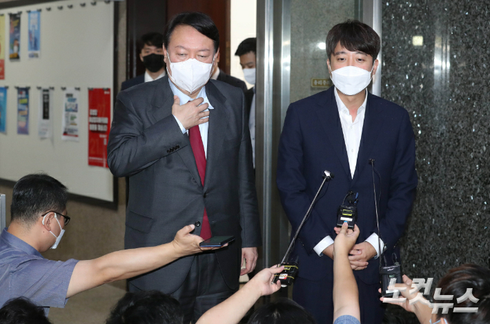 국민의힘 이준석 대표와 윤석열 대선 예비후보가 6일 국회 당대표실에서 비공개 회동 후 취재진의 질문을 받고 있다. 윤창원 기자