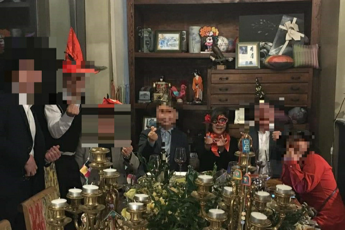 건국대 김경희 전 이사장은 김씨, 박 전 특검, 이 부부장검사 등과 골프 및 식사 모임을 하며 어울려왔다. 사진은 지난 2020년 10월. 왼쪽부터 가짜 수산업자 김모씨의 지인, 이 부부장검사, 김씨, 건국대 교수, 김 전 이사장, 건국대 교수, 식당 주인. 독자 제공
