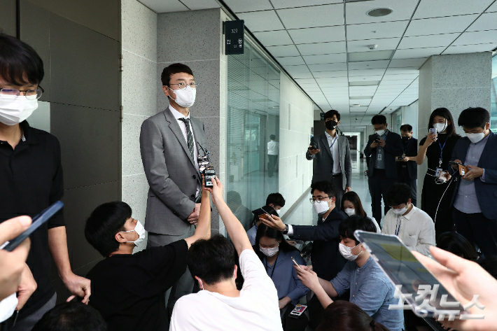 고위공직자범죄수사처가 10일 윤석열 전 검찰총장의 '고발 사주' 의혹과 관련 국민의힘 김웅 의원의 국회 의원회관 사무실 압수수색에 들어간 가운데 김웅 의원이 사무실 앞에 잠시 나와 입장을 밝히고 있다. 윤창원 기자