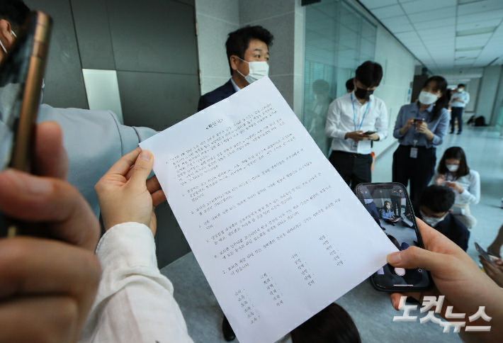 고위공직자비리수사처수사관들이 윤석열 전 검찰총장의 이른바 고발사주 의혹과 관련, '키맨'으로 지목된 국민의힘 김웅 의원의 국회 의원회관 사무실 압수수색에 나선 10일 국민의힘 유의동 의원이 김웅 의원실 측에서 작성한 압수수색 과정에 대한 '확인서'를 보여주며 불법적인 압수수색이라고 주장하고 있다. 윤창원 기자