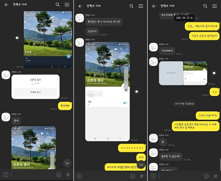 그런데 전 기자가 손 검사 실제 번호를 저장한 상태에서 확인한 텔레그램 프로필 사진도 조씨 스마트폰에 저장된 '손 준성' 사진과 같았다. 들판에 소나무 두 그루가 찍힌 모습이었다.