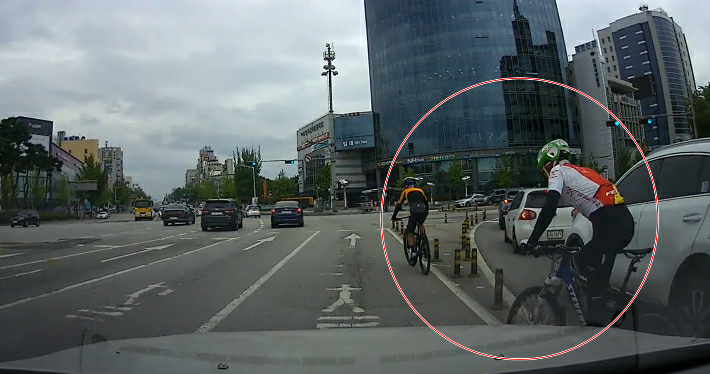 작성자 A씨가 공개한 영상에는 직진 차선에서 도로 주행 중인 자동차 앞으로 갑자기 자전거 한 대가 불쑥 나타나는 모습이 담겨있다. 놀란 운전자가 갑자기 차를 멈추자, 그 뒤로 다른 자전거 한 대가 지나가면서 왼손을 살짝 들어 보인다.