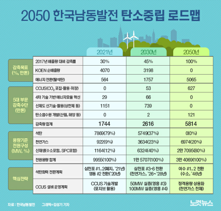 13일 CBS가 구자근 의원실로부터 입수한 한전 자회사 남동발전의 '2050 탄소중립 로드맵'의 핵심 내용은 '오는 2046년까지 가동중인 모든 석탄화력발전소를 폐쇄하고 천연가스와 수소발전소 또는 태양력과 풍력 같은 신재생에너지 발전으로 전면 전환하겠다'는 것이다.