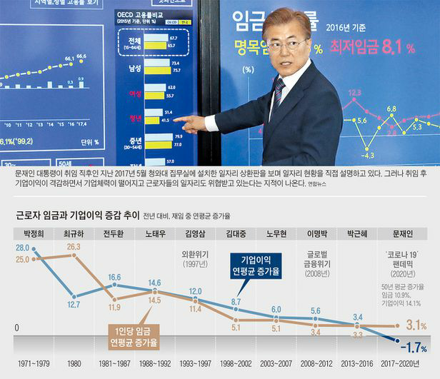 한국은행이 국민처분가능소득의 세부 자료를 공개하기 시작한 것은 1970년이다. 이후 역대 대통령 재임 중 기업 이익이 마이너스 성장을 기록한 사람은 문 대통령이 처음이다. 물가가 매년 상승하기 때문에 근로자 임금과 기업 이익은 대체로 매년 오른다. 박정희 대통령(분석 대상 1971~1979년) 시절 근로자 임금은 매년 25%, 기업이익은 28% 증가했다. 최규하·전두환·노태우·김영삼·김대중·노무현·이명박·박근혜 대통령 시절에도 기업 이익은 연평균 3.4~16.6% 증가했다. 이처럼 역대 대통령들은 기업의 성장 엔진을 살려가며 1인당 근로자 임금을 연평균 3.3~26.3% 올려줬다.