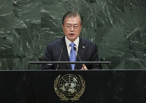 지난 2019년 미국 뉴욕 유엔본부에서 열린 유엔총회에 참석해 한반도 평화 구상 등을 내용으로 기조연설하는 문재인 대통령. 문 대통령은 내주 열리는 유엔총회에서도 미국 등 국제사회를 향해 대북 지원과 미북 대화 재개 등을 제시할 전망이다. /뉴시스