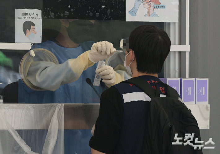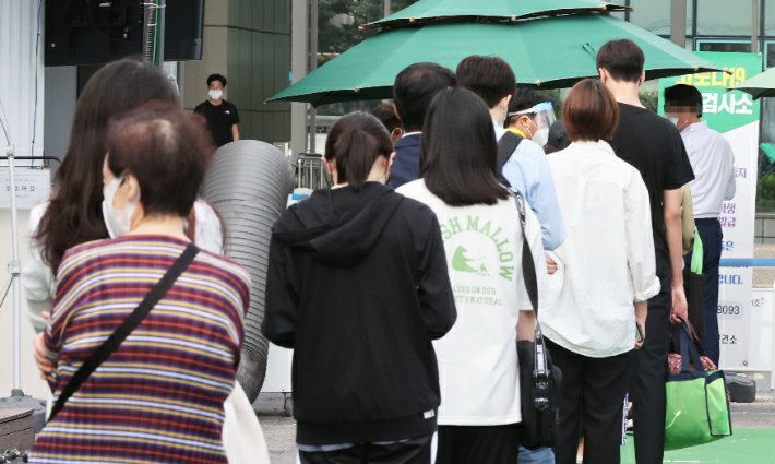 17일 서울 서초구 고속버스터미널 임시선별검사소에서 시민들이 줄을 서서 검사를 기다리고 있다. 연합뉴스
