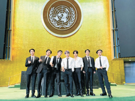 20일 지속가능발전목표 고위급 회의(SDG 모멘트) 행사에 청년 세대 대표로 참석한 방탄소년단(BTS). 이들은 연설과 함께 유엔 본부를 무대로 한 ‘퍼미션 투 댄스’ 퍼포먼스 영상도 공개했다. [사진 BTS 트위터 ]