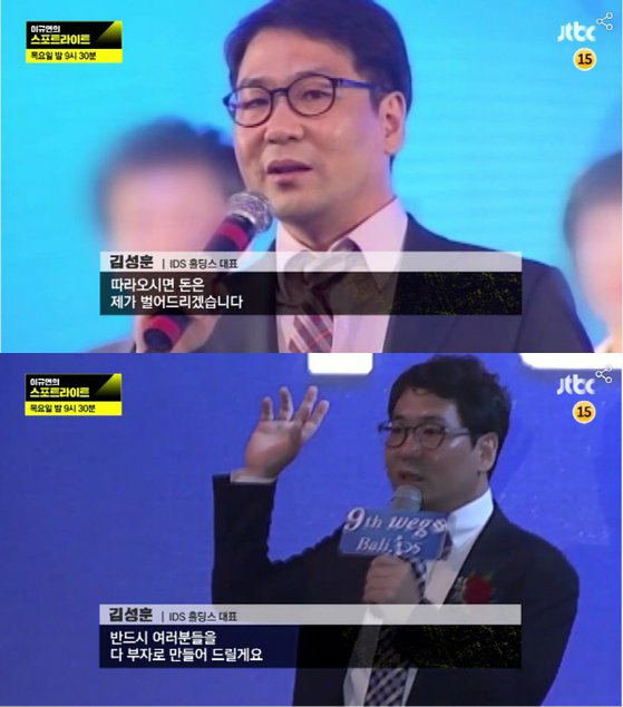 김성훈 IDS홀딩스 전 대표는 2011~2016년 피해자 1만2000명으로부터 약 1조1000억원의 투자금을 편취한 혐의(특정경제가중처벌법상 사기, 방문판매법 위반 등)로 징역 15년의 확정판결을 받아 현재 복역 중이다. 검찰은 지난 8월 그의 뇌물공여죄에 대해서도 추가 기소했다. JTBC 캡처
