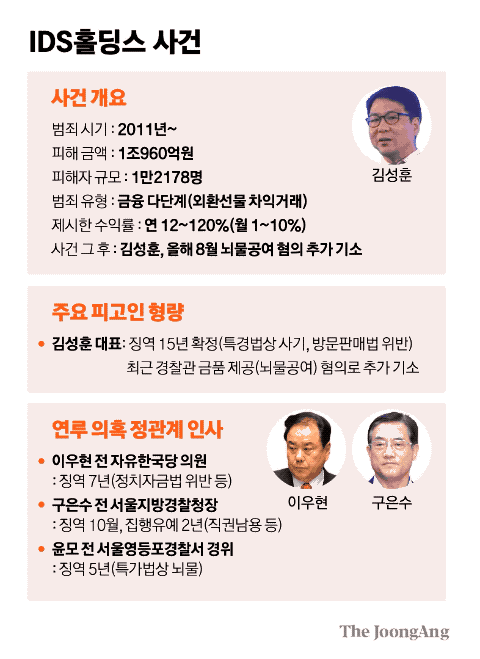 서민 꿈 짓밟은 금융사기공화국 재판 중 1조 사기 뇌물 준 김성훈 3년 뒤 기소 檢 IDS홀딩스 2011~2016년 피해자 1만2000명 약 1조1000억원 투자금 편취 혐의 징역 15년 확정판결