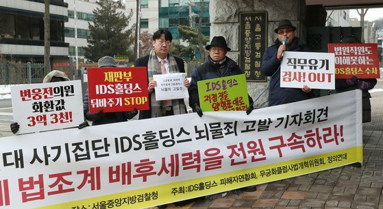 이민석 변호사(왼쪽 세 번째)와 IDS홀딩스 피해자연합회 회원 등이 2017년 12월 20일 오전 서울 서초동 서울중앙지법 앞에서 'IDS홀딩스 대표 김성훈 뇌물죄 고발 기자회견'을 하고 있다. 뉴스1