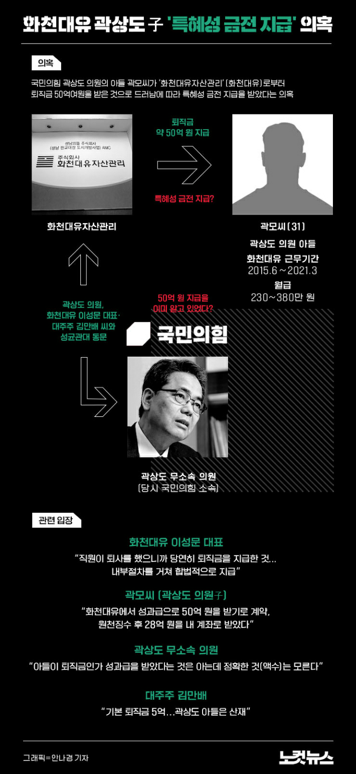 ◇ 김현정> 그래요. 계속 말씀드리지만 여러분, 조각조각 중에 나오는 조각이 어떤 것이냐를 따지지 않고 성실하게 한번 우리가 퍼즐을 맞혀보죠. 곽상도 의원 아들이 50억 원의 퇴직금, 성과급, 산재보상금 받은 건 일단 팩트예요.