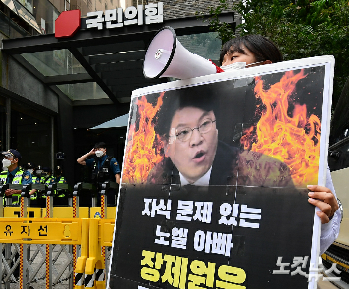 한국대학생진보연합 소속 학생이 27일 오후 서울 여의도 국민의힘 당사 앞에서 집행유예 기간 중 무면허 음주운전 및 경찰관 폭행 혐의를 받고 있는 래퍼 노엘(장용준)의 아버지 국민의힘 장제원 의원의 사퇴를 촉구하는 동시다발 1인시위를 하고 있다. 황진환 기자