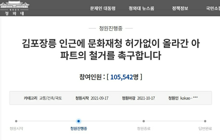 ◆ 손수호> 아직 철거를 하라고 한 건 아닙니다마는 그럴 가능성이있어서 갈등이 심각할 수밖에 없는데 이거 철거해야 된다는 청와대 국민청원 동의가 13만 명이 넘었습니다. 그냥 두면 나쁜 선례가 돼서 앞으로 문화재보호법 어길 생길 거라는 거죠. 또 이게 장릉 쪽으로 200m 더 가까운 곳에 준공한 15층 아파트가 있는데 이때는 문화재청장 허가를 받았어요. 그래서 왕릉 최대한 가리지 않도록 한쪽으로 지어졌습니다.