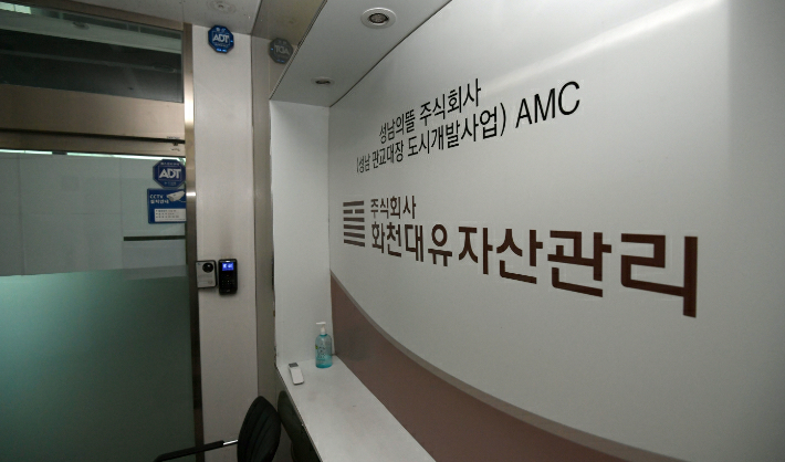 27일 오전 경기도 성남시 분당구 대장동 개발 사업 특혜 의혹을 받고 있는 화천대유 자산관리 사무실 모습. 이한형 기자