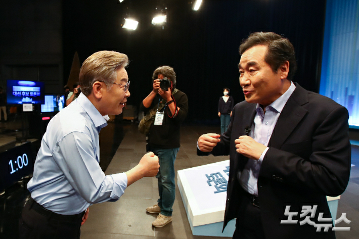 28일 서울 목동 SBS에서 열린 더불어민주당 제20대 대선 후보 TV토론에서 이재명 후보(왼쪽)와 이낙연 후보(오른쪽)가 인사하고 있다. 국회사진취재단