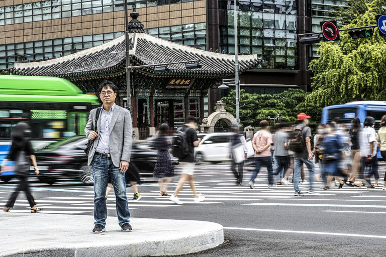 광화문 4거리에서 포즈를 취한 김경율 회계사 / 이신영 영상미디어 기자
