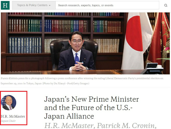 맥매스터(왼쪽 붉은상자)는 허드슨 연구소에 올린 글에서 아베 전 일본 총리에 대해 "자유롭고 개방적인 인도태평양 지역의 비전 촉진에 성공했다"고 추켜세우면서 기시다 일본 총리에 대해서도 "미국과 일할 엄청난 기회를 가지고 있다"고 평가했다. 허드슨 연구소 캡처