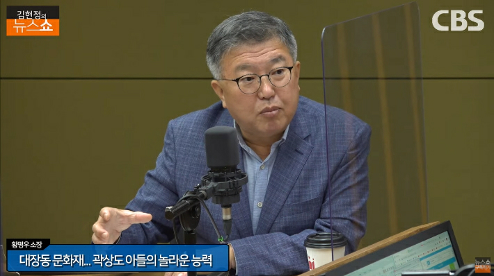대장동 의혹은 커다랗게 두 개의 축으로 보시면 됩니다. 한 축은 내부의 의혹. 그러니까 민과 관이 유착해서 사업 이익을 나눈 거 아니냐. 이 의혹이고 또 한 축은 외부를 향한 로비, 즉 정관계 로비의혹이죠. 이 두 축을 중심으로 여러 개의 조각들이 지금 막 쏟아져 나오고 있는 건데요. 그중에 한 가지 조각이 바로 곽상도 의원 아들의 수상한 퇴직금. 이 조각이죠. 화천대유 직원이었던 곽 의원 아들, 불과 5년 7개월 일하고 어떻게 50억 원의 퇴직금을 수령했는가. 여기에 대해서 곽 의원 아들 곽병채 씨는 이렇게 말했습니다. 풀기 어려운 문화재 문제를 해결한 공이 있었다. 대체 문화재와 관련해서 무슨 공이 컸기에 50억 원이나 받아갔는가, 궁금증이 이어졌는데 어제 국감장에서 이와 관련된 의혹 제기가 있었습니다. 어제 그 국감에 참고인 자격으로 출석했던 분 한국문화유산정책연구소 황평우 소장 스튜디오에 나오셨어요. 어서 오십시오, 소장님.