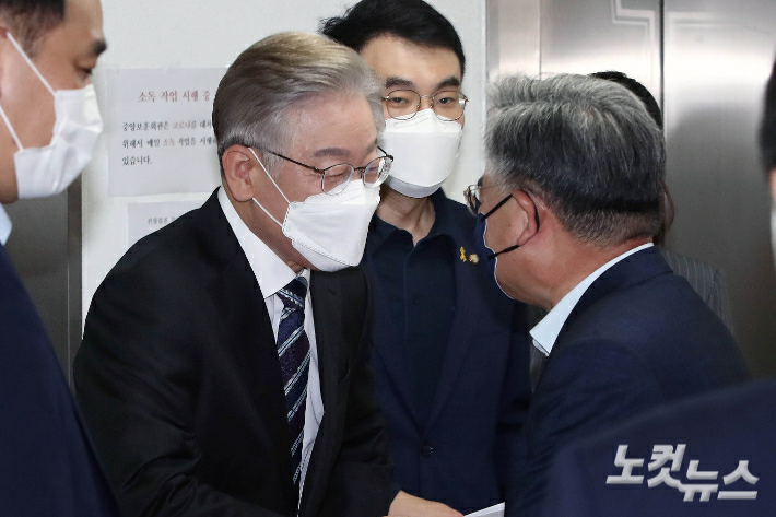 더불어민주당 대선 경선 후보인 이재명 경기도지사가 6일 오후 서울 여의도 열린민주당 당사에서 열린 '대장동 국민의힘 게이트, 열린민주당이 묻고 이재명이 답하다' 열린민주당TV 유튜브 라이브 방송에 출연하기 위해 방문해 열린민주당 관계자들과 인사를 나누고 있다. 윤창원 기자