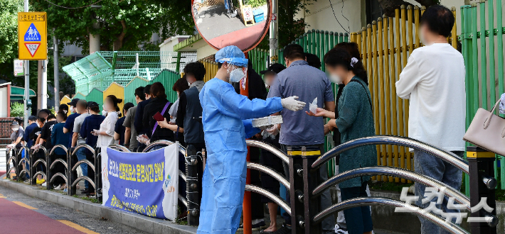 코로나19 신규 확진자가 2천383명 발생해 일요일 발생 기준 역대 최다를 기록한 27일 오전 서울 구로구보건소에 마련된 선별진료소에서 시민들이 검사를 받기 위해 줄서 기다리고 있다. 황진환 기자