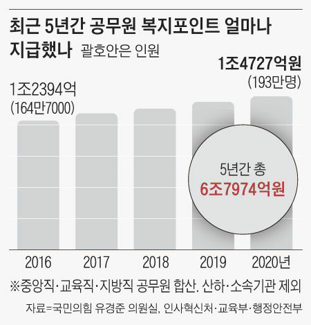 같은 복지포인트인데 공무원과 일반 직장인에 대한 과세 기준은 다르다. 법제처가 2006년 공무원 복지포인트는 근로소득으로 잡히지 않는다는 유권해석을 내려줬기 때문이다. 7일 국회 기획재정위 유경준 의원(국민의힘)이 인사혁신처·행정안전부·교육부 제출 자료를 분석한 결과, 공무원 복지포인트에 세금을 매겼을 경우 최근 5년(2016~2020년) 더 걷을 수 있었던 소득세가 최대 1조196억원(공무원 한계세율 15% 적용), 건강보험료는 4530억원이었던 것으로 집계됐다.