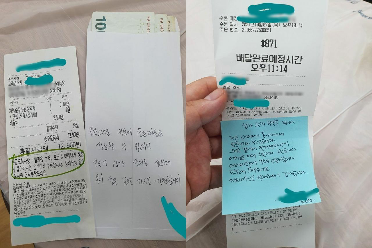 그가 올린 사진에는 영수증이 찍혀 있었다. 배달 장소로 장례식장을 적은 유가족은 주문요청사항에 “어머니가 생전 좋아하시던 음식이라 주문합니다. 장례식장 앞에 오시면 연락 부탁드려요”라고 적었다. 그러자 된장찌개를 배달한 가게는 “갑작스러운 비보에 슬픈 마음을 가늠할 수 없겠지만 고인의 삼가 조의를 표하며 부디 좋은 곳으로 가시길 기원합니다”라고 적힌 봉투에 조의금 3만원을 넣어 함께 보냈다.
