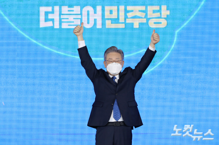 더불어민주당 이재명 대선 경선 후보가 10일 서울 올림픽공원 SK핸드볼경기장에서 열린 서울 합동연설회 및 3차 슈퍼위크 행사에서 더불어민주당 대선 후보로 확정된 후 엄지손가락을 들어보이고 있다. 박종민 기자