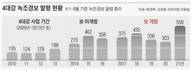 12일 김성원 국민의힘 의원실이 환경부에서 제출받은 ‘연도별 조류(녹조)경보제 발령 현황’에 따르면, 올 1~9월 낙동강 10여개 측정 지점에서 발령된 경보는 총 491회로 작년 같은 기간(247회)의 거의 2배로 늘었다. 지난 2013년 4대강 사업 완료 이후 보를 정상 운영하던 시기(2013~2016년 1~9월 연평균 225회)와 비교해도 2.2배로 증가했다. 녹조 경보는 물 1mL당 남조류 세포 수가 1000개를 넘으면 ‘관심’, 1만개 이상이면 ‘경계’ 등의 단계로 발령된다. 특히 올해는 2015년과 2018년 등 녹조가 기승을 부리던 시기에 비해 일부 강도는 덜하지만 녹조 체류 시간은 크게 증가한 모습을 보이고 있다.