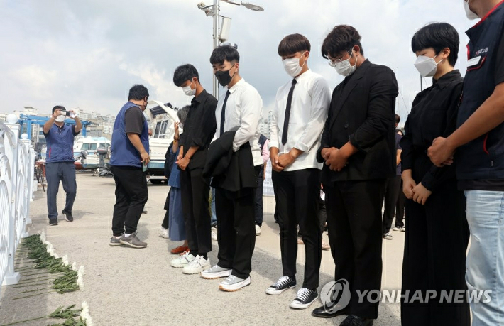 8일 오전 전남 여수시 웅천 친수공원 요트 정박장에서 현장실습 도중 잠수를 하다 숨진 특성화고교 3학년 홍정운 군의 친구들이 국화를 사고 현장에 헌화한 뒤 묵념하고 있다. 홍 군은 지난 6일 오전 요트에서 현장실습을 하던중 요트 바닥에 붙은 따개비를 제거하기 위해 잠수했다 변을 당했다.