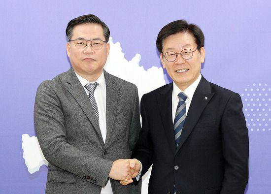 2018년 10월 1일 유동규 신임 경기관광공사 사장이 이재명 경기지사에게 임명장을 받고 기념촬영을 하고 있다. /경기관광공사 제공
