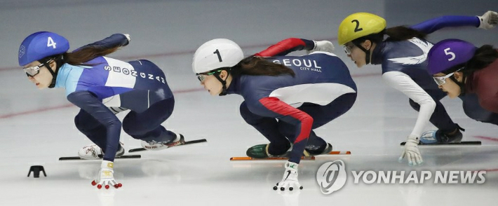 8일 서울 노원구 태릉빙상장에서 열린 2021-2022시즌 쇼트트랙 국가대표 2차 선발대회 여자부 1500m 결승. 이유빈(노란색 모자), 최민정(파란색 모자), 심석희(흰색 모자) 등 선수들이 질주하고 있다.