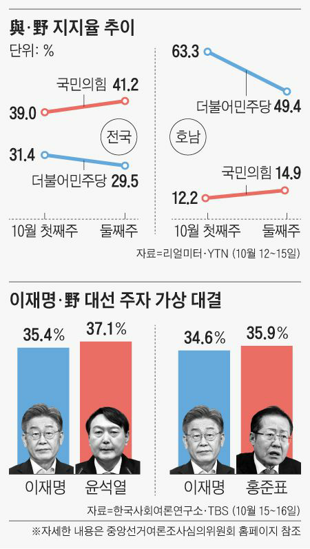 여론조사회사 리얼미터가 YTN 의뢰로 지난 12∼15일 전국 성인 2022명을 대상으로 조사한 결과(표본오차 95% 신뢰수준에 ±2.2%포인트), 민주당의 정당 지지율은 전주보다 1.9%포인트 떨어진 29.5%로 집계됐다. 반면, 국민의힘 지지율은 전주보다 2%포인트 오른 41.2%로, 당 출범 이후 최고치를 기록했다. 무당층은 9.1%였다. 특히 민주당은 호남 지역에서 당 지지율이 49.4%로 전주 대비 13.9%포인트 급락했다. 이재명 후보가 선출되기 직전인 10월 첫째 주 조사에서 호남 지역 민주당 지지율은 63.3%였다. 지난 10일 이 후보가 선출된 직후 민주당에 실망한 호남 유권자들이 늘어난 것으로 해석됐다. 이번 조사에서 호남의 ‘무당층’은 13.9%로, 전주 대비 6.8%포인트 늘었다.