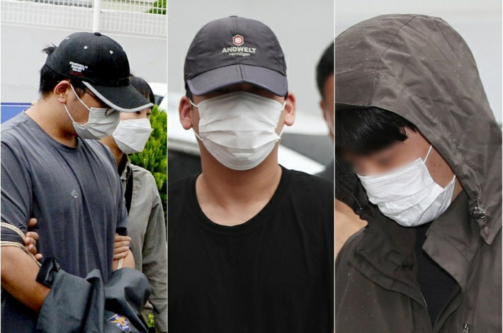 12일 오전 광주 동구 광주지법에서 살인미수 혐의를 받는 고교 동창생 3명이 영장실질심사를 받기 위해 법정으로 들어서고 있다. 사진은 왼쪽부터 남자친구 역할을 한 A(19)군, 흉기를 휘두른 B(19)군, 도주 차량 운전을 하기로 한 C(20)군의 모습. (연합뉴스)