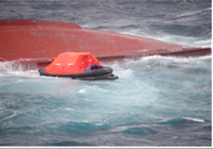 20일 오후 2시 24분쯤 독도에서 북동쪽으로 168Km 가량 떨어진 해상에서 한국인과 외국인 등 선원 9명이 탑승한 선박이 전복돼 해양경찰이 수색을 벌이고 있다. 사진은 사고 선박과 구명벌. 동해지방해양경찰청 제공
