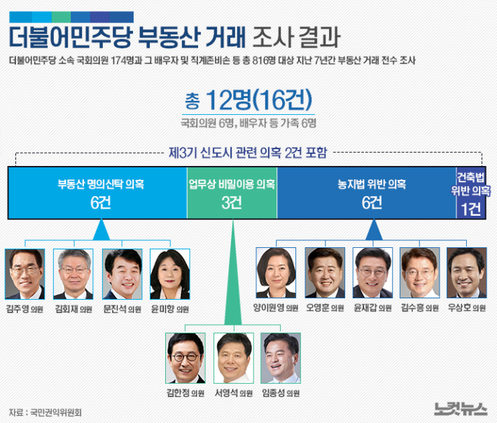 더불어민주당 송영길 대표가 '부동산 불법 거래' 의혹에 휩싸인 의원 12명에게 탈당을 권유했지만, 상당수 의원들이 수사기관으로부터 최종 무혐의 판정을 받았다. 지난 3월 한국토지주택공사(LH