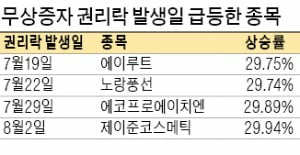 4일 한국거래소에 따르면 지난달 말부터 에이루트, 노랑풍선, 에코프로에이치엔, 제이준코스메틱 등 4개 종목 주가는 무상증자 권리락 발생일에 급등했다. 지난달 19일 에이루트는 무상증자 권리락 발생일에 29.75% 급등한 데 이어 다음날 29.90%, 그 다음날도 3.58% 올랐다. 22일엔 노랑풍선(29.74%)이 크게 상승했다. 노랑풍선은 권리락 발생일 다음날 11.63%, 그 다음날에도 11.1% 올랐다. 에코프로에이치엔은 지난달 29일 29.89% 급등했고, 지난 2일 제이준코스메틱도 29.94%, 3일 7.11% 상승했다.