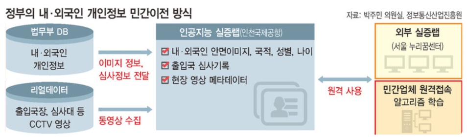 정부가 출입국 심사에 쓸 ‘인공지능’(AI) 개발 명분으로 약 1억7천만건의 내·외국인 얼굴 사진을 민간 업체에 넘긴 것으로 확...